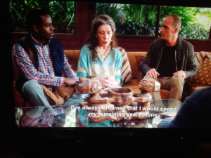 I’m watching Grace and Frankie. What’s not to like? It has gay husbands running off together. Black adopted children, and a black boyfriend for Frankie. Oh, and perhaps most significantly, the two stars are women in their 6th and 7th generations. And there’s drug addiction and childbirth and women struggling with dry vaginas. Which are all handled with the élan of the well born, well led life of the lawyerly class. Divorce conflicts occur over who gets the mansions, and who gets the…